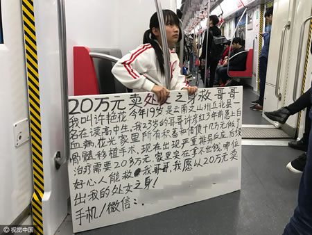 2016年11月14日消息,杭州某地铁内,一名女孩举着块牌子,写着她19岁,哥哥得了白血病,家里没有钱了,现在以20万元的价格卖自己的处女之身,还附有所谓医院的“处女证明”。供图:视觉中国