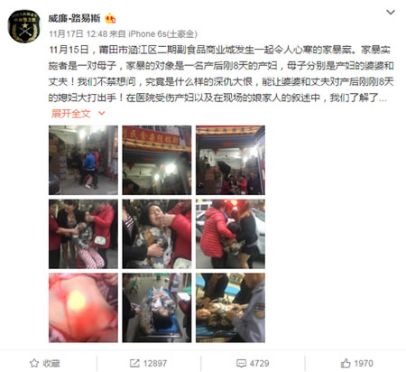 11月15日,莆田市涵江区二期副食品商业城发生一起令人心寒的家暴案。家暴实施者是一对母子,家暴的对象是一名产后刚8天的产妇,母子分别是产妇的婆婆和丈夫!我们不禁想问,究竟是什么样的深仇大恨,能让婆婆和丈夫对产后刚刚8天的媳妇大打出手!在医院受伤产妇以及在现场的娘家人的叙述中,我们了解了整个事件的大致经过以及导致这一恶劣家暴事件的缘由。