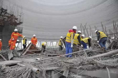 24日一早刚过7时,他们10多位工友就到达冷却塔内,进行零班与早班的交接。在他们头顶上方70多米的高处,搭建有施工平台,那里还有几十名工人。大概五分钟后,他们突然听到头顶上方有人大声喊叫,接着就看见上面的脚手架往下坠落,砸塌水塔和安全通道。在地面层工作的工人迅速往冷却塔外跑。短短十几分钟的时间内,整个施工平台完全坍塌下来。