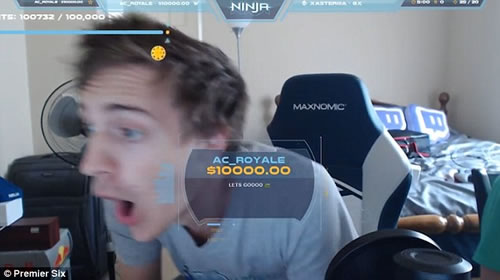 画面显示,游戏主播Ninja在收到这笔钱时显得十分震惊。他说:“今天是我五年来收到打赏额度最高的一次,感谢慷慨的观众@ACRoyale,这太不可思议了!”