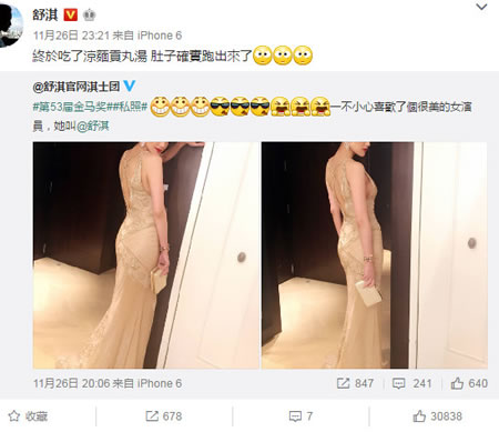 自金马奖上,舒淇上台领奖时,却被主持人陶晶莹调侃了一句:你怎么还穿着高跟鞋?疑似暗指舒淇怀孕后,舒淇更传出息影传闻。11月29日下午,舒淇更博回应息影传闻:“休息和退休是两回事儿~”,并配上一张愤怒的小猫咪照片。