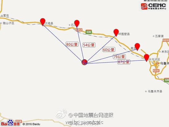 #新疆呼图壁6.2级地震#震中距玛纳斯县54公里、距呼图壁县60公里、距昌吉市76公里、距沙湾县80公里、距头屯河区87公里,距地级市石河子市57公里,距省会城市乌鲁木齐市103公里。