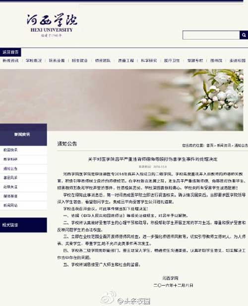 经网友爆光的河西学院医学院护理专科165班主任吕平,因为学生迟到让学生互扇耳光才能进教室事件后,河西学院官网于今早发布《关于对医学院吕平严重违背师德侮辱殴打伤害学生事件的处理决定》,对吕平老师予以解聘,做好受害学生心理干预与疏导,尊重和保护受害和反映问题学生的合法权益,接受社会监督。以下为吕平处理决定全文: