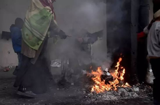 12月18日,在叙利亚北部城市阿勒颇市吉卜林临时安置点,从反政府武装控制区撤出的平民生火取暖。