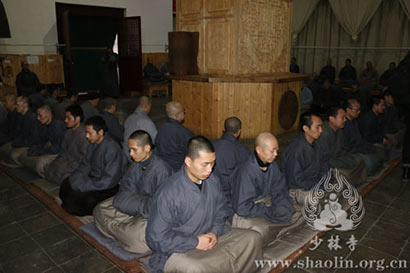 早晨六点三十分,和尚与大众一起过堂,东西两单座无虚席。随之,诸师于堂内行香。挂过二板二钟后,侍者传解七牌,和尚打过警策,开示道:“今年的精进禅七马上结束了,才起七又解七,诸位老参新修在少林寺禅堂用功办道,成就究竟真如智慧,庄严圆满。禅宗之所以广弘千古、祖师辈出,就是因为许多祖师大德在禅堂用功、开悟,获得究竟解脱,有着切身受益。大家能够在少林寺参禅悟道,可谓因缘殊胜。禅堂即是选佛场,希望大家继续在这里用功办道,勇猛精进,早证菩提。”
