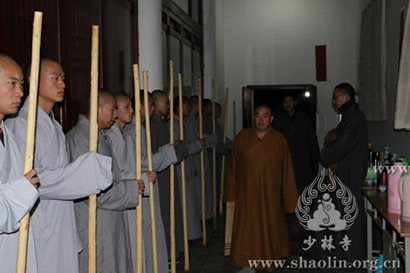 永信大和尚打警策(图片来源:少林寺摄影:王海涛)