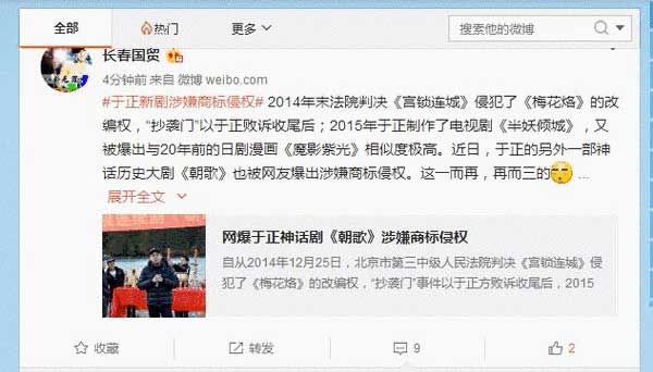 1月16日据知名博主“长春国贸”爆料称于正神话剧《朝歌》涉嫌商标侵权;2014法院曾判决《宫锁连城》侵犯了《梅花烙》的改编权,“抄袭门”事件以于正败诉收尾后,2015年于正又制作了电视剧《半妖倾城》,又被网友爆出与20年前的日剧漫画《魔影紫光》相似度极高,近日,作为于正另外一部神话历史大剧《朝歌》也被网友爆出涉嫌商标侵权。