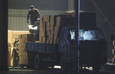 1月4日晚,天津兴达物流园福建专线,这辆车牌号为“津ML6319”的小货车从各造假窝点将数百件假调料运到这里。本版摄影/新京报记者 大路