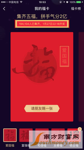 今年的五福卡依旧是爱国福、富强福、和谐福、友善福以及敬业福,但还新增加了“万能福”与“顺手牵羊卡”,其中万能福可代替任意一张福卡,而顺手牵羊卡则可随机抽取好友手中的福卡。