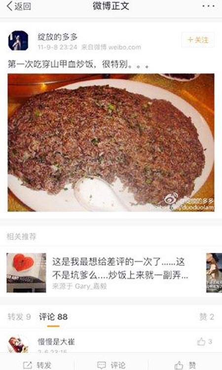 近日,“绽放的多多”所发布的微博信息被网友曝光,随后引发轩然大波,数百名网友留言对其进行了谴责。据其微博信息显示,其所在地为广东深圳。目前,该网友微博中关于食用穿山甲的信息已被删除。