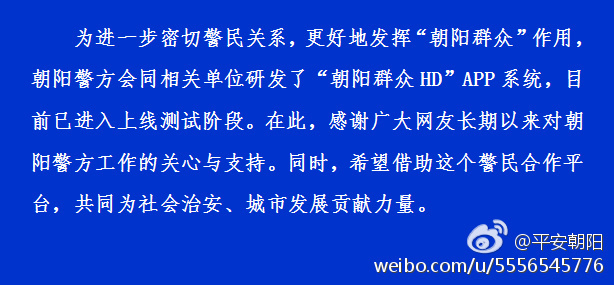 新京报快讯(记者李禹潼) 今日(2月13日)晚间,北京市公安局朝阳分局通过微博“平安朝阳”发布消息称,为进一步密切警民关系,更好地发挥“朝阳群众”作用,朝阳警方会同相关单位研发了“朝阳群众HD”APP系统,目前已进入上线测试阶段。