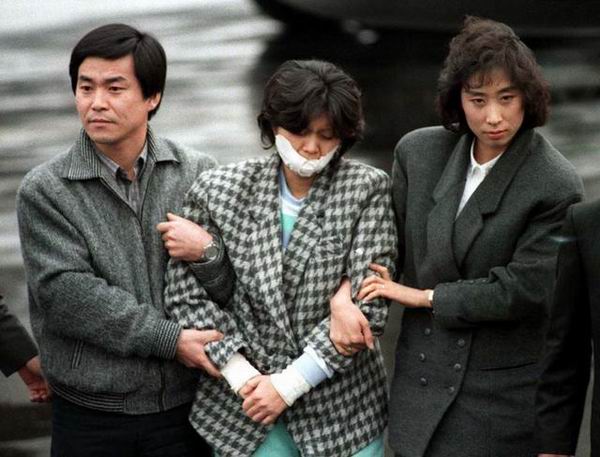 被押解到韩国的金贤姬,注意她的嘴被韩方封死,防止服毒自尽。