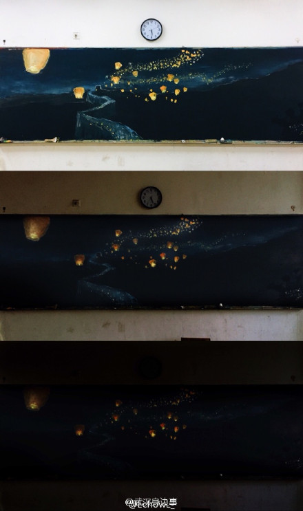 她是班上的宣传委员,两年时间里,她已经画了七八幅黑板报。雄伟绵延的长城、漫天的孔明灯……张艺谋电影《长城》中的一幕被她搬到了黑板报上。她还突发奇想的在水粉画中加入了荧光涂料,让这幅黑板报在不同光线下,甚至黑夜里,都能呈现惊艳之感。这幅黑板报出来后,3张不同光线下的画在老师学生的群里疯传,大家都特别喜欢。