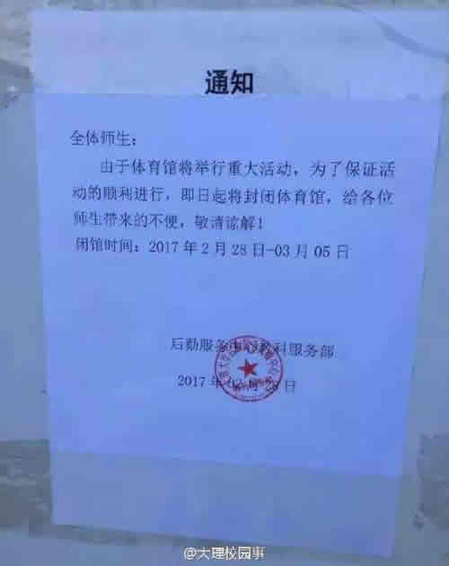 2月28日至3月5日大理大学古城校区封闭体育馆的通知