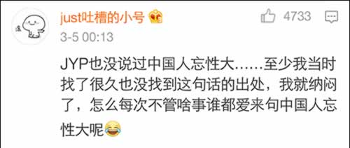 当时有谣言称“JYP说中国人忘性大”,却并无权威消息源。