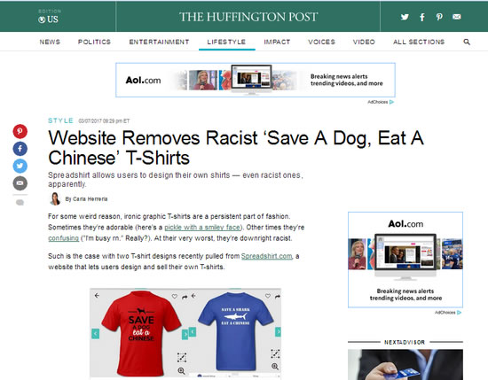 《赫芬顿邮报》称,写有一些猎奇或好玩字眼的文化衫、T恤衫在世界各地不是什么新鲜事,但也有人把一些带有种族歧视性质的内容印上去。让用户自己设计和销售定制服装是Spreadshirt的一种营销模式。北美华裔社区一家网站发现,3月初,Spreadshirt的两个用户定制了带有冒犯中国人内容的T恤,其中一款T恤写有“救一只狗,吃一个中国人”,另一款写有“救一条鲨鱼,吃一个中国人”。尽管这两款T恤并不是由Spreadshirt设计,但还是有相当多的人对该公司允许销售此类产品感到失望。