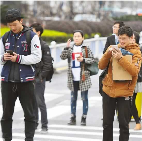 昨天,在杭州市西湖文化广场旁的斑马线前,许多行人低头看手机。
