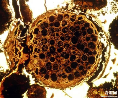 通过对岩石的超薄切片,研究人员能够利用光线看清其中的结构,就像是看一面彩色的玻璃。他们观察到多个细胞,成圆球形聚集一起。肖书海说,这些细胞在形状和大小方面都彼此不同,这表明它们已经发展出不同的组织类型,或许已具有不同的细胞功能。“这在细菌和原生生物中是无法找到的,具有明显的多细胞组织的复杂度。”