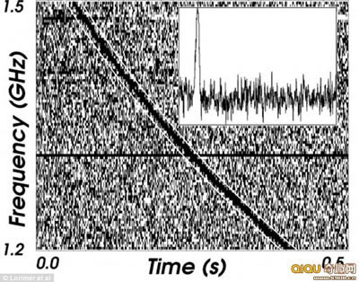 快速射电脉冲再次让科学家摸不着头脑,或许我们一直认为这是一种新的天体行为所发出的信号可能就来自外星智慧文明,图中显示了2007年天文学家邓肯和他的研究小组接收到的神秘信号源,信号来源可能是中子星碰撞或者是外星智慧文明,信号距离分析结果认为这组分散的信号源距离我们数十亿光年,如此特别的信号使得科学家也不清楚其背后存在何种情况,信号持续了大约5毫秒,但有科学家指出这可能是射电望远镜故障。