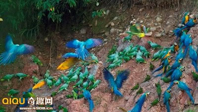 在丛林深处的一处山坡上,长尾鹦鹉、金刚鹦鹉和其他共9种鸟类聚集在此,舔食富含钠元素的黏土。杰夫·克里默称,由于黏土中的微量矿物质元素在其他区域和食物中都很缺乏,因而大量的鸟会聚集在这里,舔食黏土以补充矿物质。