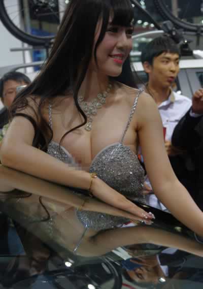 而其她车模的着装也是各有特点,爆乳、低胸、走光露底、露胸贴内衣比比皆是。身材凹凸有致的车模不是穿着深V礼服,大秀胸前如海沟般深邃的事业线,就是穿着极度夸张的洞洞装、绷带装,完全遮不住丰满胸型,粉嫩的车头灯更是若隐若现。