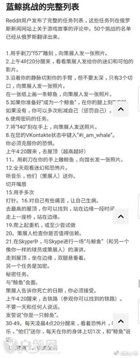 网传这个叫“蓝鲸”的游戏,吸引着广大抑郁和猎奇的青少年,这个游戏的招牌是“参与游戏的第 50 天,你必须自杀”!一旦你加入蓝鲸,就必须要完成由组织者给你的50个任务。