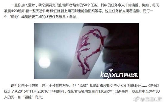有媒体称,玩家们的游戏任务已经不是什么神秘的事情,入会前就已经明确告知,50天后请你去死,在这一点上,它并没有欺骗性,反而成了自杀意愿者的集中营。也就是说,那些人本来就有自杀计划,而这并不是蓝鲸的错。
