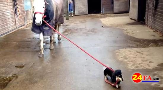据英国《每日邮报》5月8日报道,近日,一段迷你腊肠犬在马厩外遛马的视频在网络上迅速蹿红。视频中,3岁大的迷你腊肠犬用嘴叼住红绳,牵着一只体型大它数倍的康尼麻拉马,绕着马厩遛弯,画面十分有爱。
