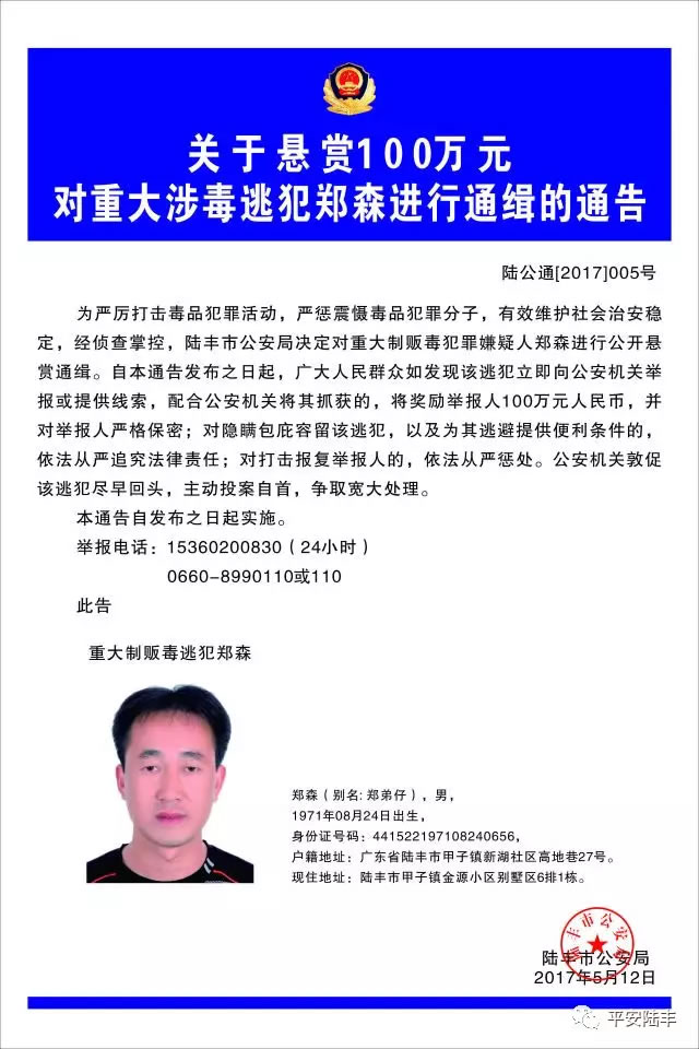 原标题:重磅!教你一招,立马成为百万富翁!陆丰市公安局悬赏100万元对重大涉毒逃犯郑森进行公开通缉