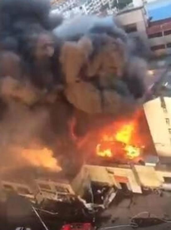 记者现场在现场看到,6点半左右,警方的封锁警戒线又从灯具城附近,向外延伸了一段距离,接近胜利西街。7点40分左右,仍能看到滚滚黑烟。