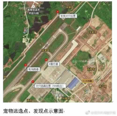 机场方面透露,5月24日,一名旅客托运的宠物狗经东航MU2544航班从上海浦东机场出发到达武汉天河机场。25日00:28,保障东航MU2544航班行李分拣员在打开航空器后舱门后,发现有一活体动物跳出货舱门并迅速逃离,东航现场工作人员立即采取抓捕措施未果。01:00,东航请求机场协助,机场立即根据中国民用航空总局191号令(货物运输部门所载运的动物在机场内逃逸时,应当立即抓捕并及时通知机场管理机构),启动活体动物逃逸应急处置预案,派出8名工作人员参与围捕,经过40多分钟分区搜寻,在机场西飞行区环场路围界处发现该宠物。