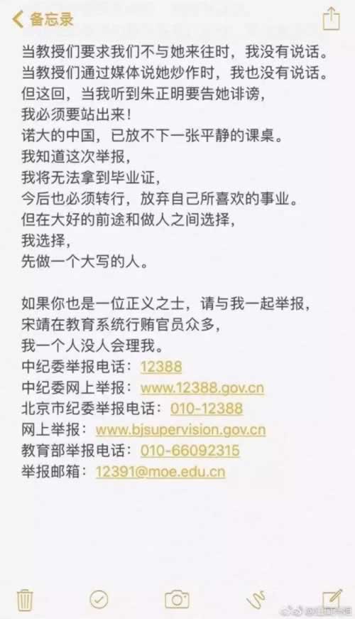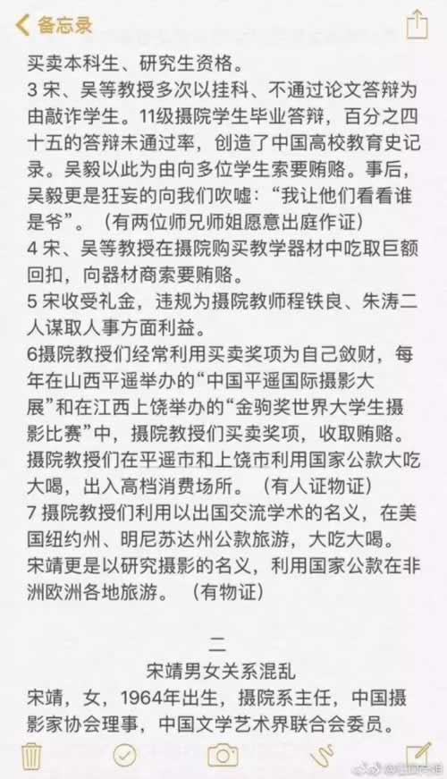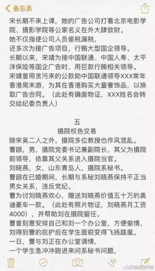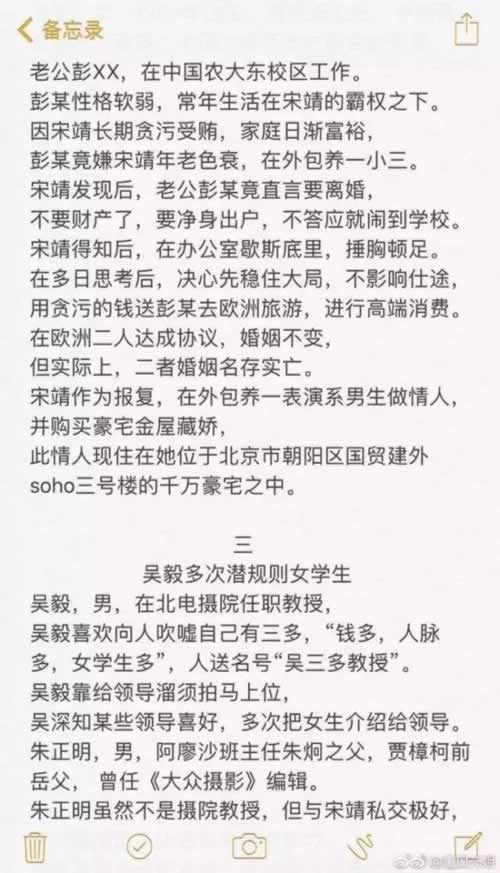 文中实名举报称,宋靖教授资产过亿,在北京有八套豪宅,其中在国贸的两套房子市值分别都超过1100万,这名女教授还包养了表演系男生做情人。另一名吴毅教授则多次骚扰女学生,其他教师也有多种不堪事迹。