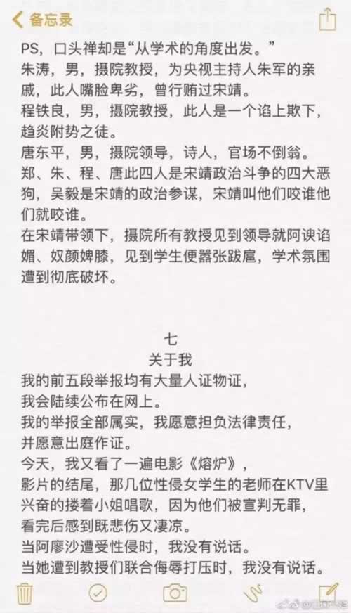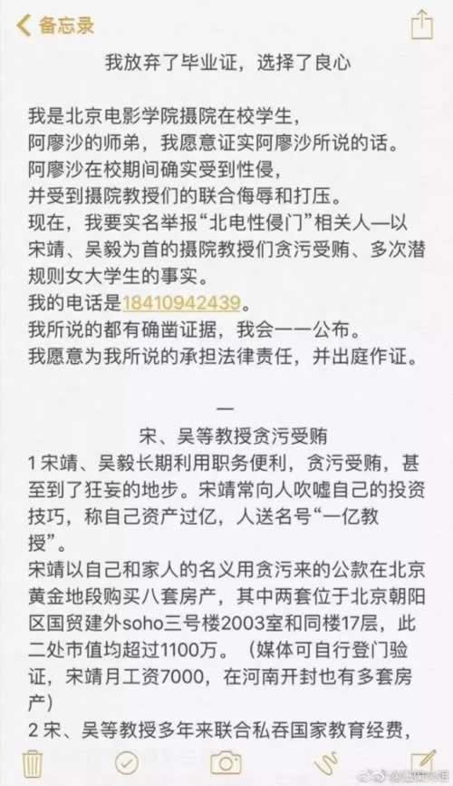 6月5日10点44分,微博名为@北电侯亮平 的博主自称是北京电影学院性侵案中当事人阿廖沙的师弟,他可以证实阿廖沙所说属实。同时实名举报摄院以宋靖、吴毅为首的教授们多次潜规则女大学生,常年贪污受贿的事实。以下为微博全文:
