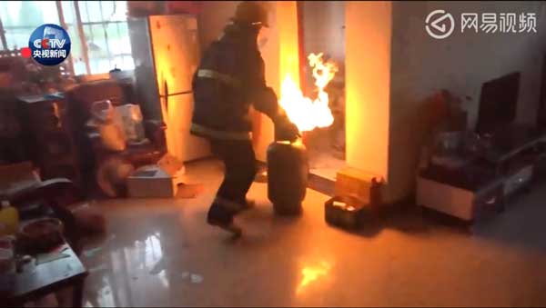 近日,在陕西省汉中市汉台区一栋居民楼三楼住户的厨房煤气罐着火。消防人员赶到发现,煤气罐向外喷射的火焰足有半米多高,由于煤气罐阀门已经烧坏无法关闭,所以只能等煤气罐中的气体燃烧完毕。但是随着煤气罐温度不断升高,发生危险的几率也在增大。危急时刻,消防战士周鹏家立刻将着火的煤气罐抬了出来,并一直抱到楼下空旷处。等候在现场的另外一组消防官兵立即用水枪对煤气罐进行降温冷却处理,经过一番努力,险情终于被排除。