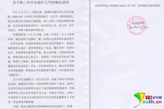 打人学生虽属防卫,但方式欠妥,造成了相对不好的社会反响。调查组对白铁二中的领导班子进行了谈话,由班主任级学生家长对涉事学生进行了批评教育和思想疏导。目前,涉事学生已经认识到行为的不当之处,并作出了检讨。白铁二中的领导班子及班主任老师因对学生思想品德教育上不到位,做出深刻书面检查。
