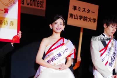 据悉,日本青山大学每年都会按照惯例举行校花校草大赛,日前,该大学举办了2014年度校花校草大赛。此次担任“miss&mr青山评选”的总决赛中各有3位候选人,总共6人登场,在情景表演、婚纱展示、晚礼服走秀三个环节之后,安倍萌生获得最终夺得校花桂冠。