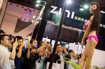 和往届一样,部分参展商家为了吸引观众,特意请来热舞女郎现场表演,本届更随处可见金发碧眼、笑容妖媚的外国女郎。