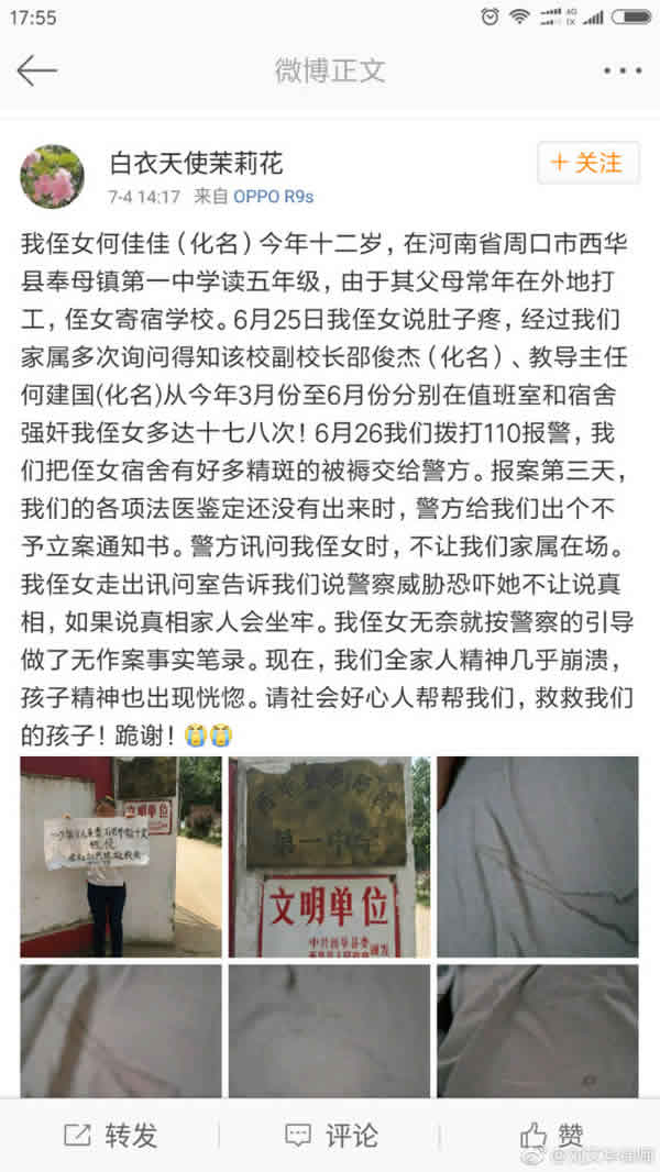 7月4日晚,河南省西华县公安局官方微博“平安西华”发布,关于对网民“白衣天使茉莉花”在新浪微博发布严重失实消息的情况通报。