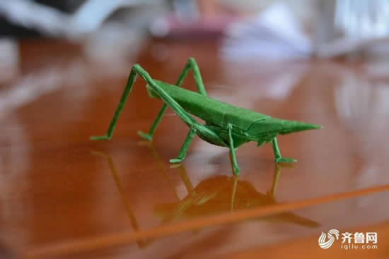 孙洪涛展示的“纸蚂蚱”作品,绿油油的蚂蚱栩栩如生,甚至蚂蚱头部和每条腿的关节都十分精细,似乎随时都会蹦跳起来。