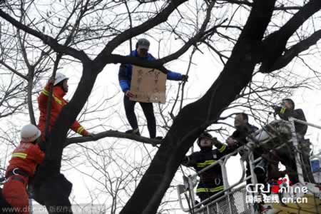 2014年12月5日下午1点左右,一名30岁的男子在北京协和医院东区门口,爬上了路边的一棵树,称要卖肾。消防人员和警方随即赶到现场进行处置,在经过了3个多小时的劝说之后,消防人员和警方才利用消防吊臂车将这名男子从树上解救下来。事件造成了东单北大街双方向交通出现拥堵。图为消防人员动用吊臂车将男子脱离大叔,警方随即将改名男子带离现场。