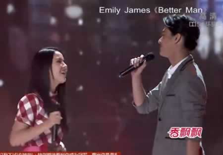 当被问及为何做这样的选择时,Emily表示选择James的理由是:“交流方便很多,终于可以说英文了。”选择第一季“人气王”的理由当然不止于此,Emily透露,从第一季“梦之声”起,自己就十分关注James的表演,并夸他“长得真的很帅气”。可爱乖巧的Emily和James在“帮帮唱”环节中合作,二人的一曲《Better Man》又跳又唱形成是全场“最养眼”的组合。