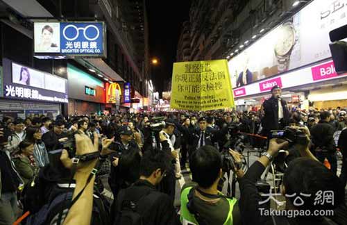 大公网12月25日讯(记者 冼国强)“占中”阴魂未散,多个团体趁昨日平安夜发起与“占中”相关的后续活动。约300名示威者在铜锣湾以“报佳音”为名阻塞街道并高唱讽刺政府及警方的改编歌曲,警方数度出示黄旗要求示威者离开。社民连立法会议员梁国雄临近凌晨12时到铜锣湾,示威者又到时代广场钟楼举起黄色直幡之后散去,又声称元旦见。旺角则有约600人在弥敦道一带四处游荡,警方一度警告在场市民正参与一个未经许可的非法游行,要求在场人士立即解散,否则拘捕。