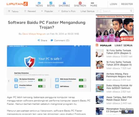 图:雅加达媒体称百度PCFaster存在恶意行为