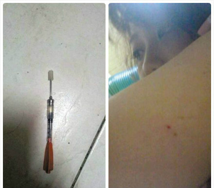 11月25日,天津窦女士在网上发帖称,凌晨出行时被带有尾翼的针头射中臂部,“当时感觉胳膊很疼,”随后感到身体发软,随后在脚边发现一枚医用针管,针筒内还有约5ml的液体。窦女士认为针管里肯定是麻醉药物,当即拨打110报警,随后立即跑到附近一家商场,这期间一直被出租车跟踪,“并想强行把我带走,但当时商场里有施工人员,可能就没敢”。窦某在发布的网帖中公布了刺中自己的针头和胳臂上的红点。
