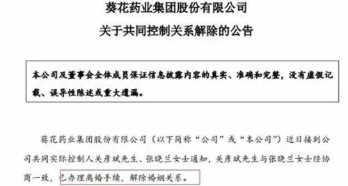 7月12日晚,A股上市公司葵花药业发布了几则公告,公司实际控制人夫妇关彦斌、张晓兰夫妇已经于近日办理离婚手续,解除了婚姻关系。公司实际控制人由关彦斌、张晓兰夫妇变更为关彦斌。