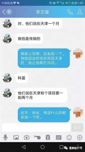 李文星入职“科蓝公司”后告诉同学担心是传销。手机截图