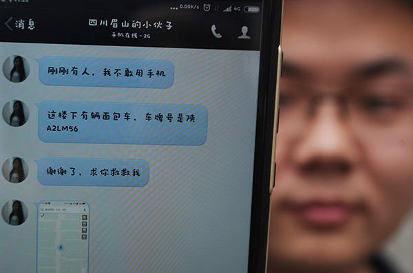 2016年11月,陕西西安,大四学生张某展示他在手机聊天软件上跟“附近的人”的聊天记录。根据聊天信息,警方将发出求救信息的被困人员救出。 视觉中国 资料图