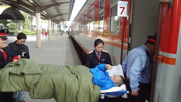 2014年1月,福建漳州,范某在车站工作人员的协助下被抬上了回家的火车。视觉中国 资料图