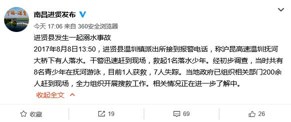 经初步调查,当时共有8名青少年在抚河游泳,目前1人获救,7人失踪。当地政府已组织相关部门200余人赶到现场,全力组织开展搜救工作。相关情况正在进一步了解中。