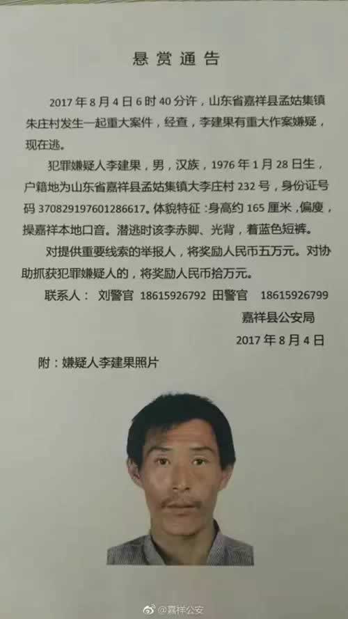 2017年8月4日6时40分许,山东省嘉祥县孟姑集镇朱庄村发生一起重大案件。经查,李建果有重大作案嫌疑,现在逃。